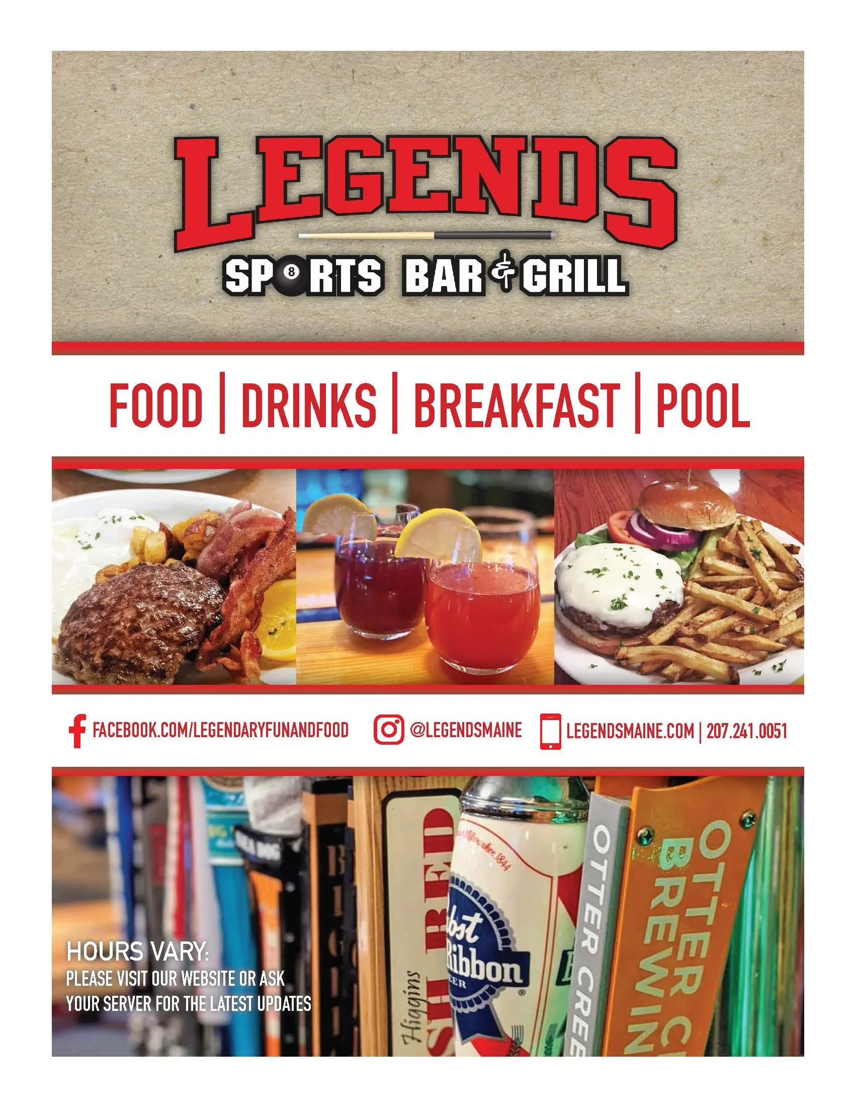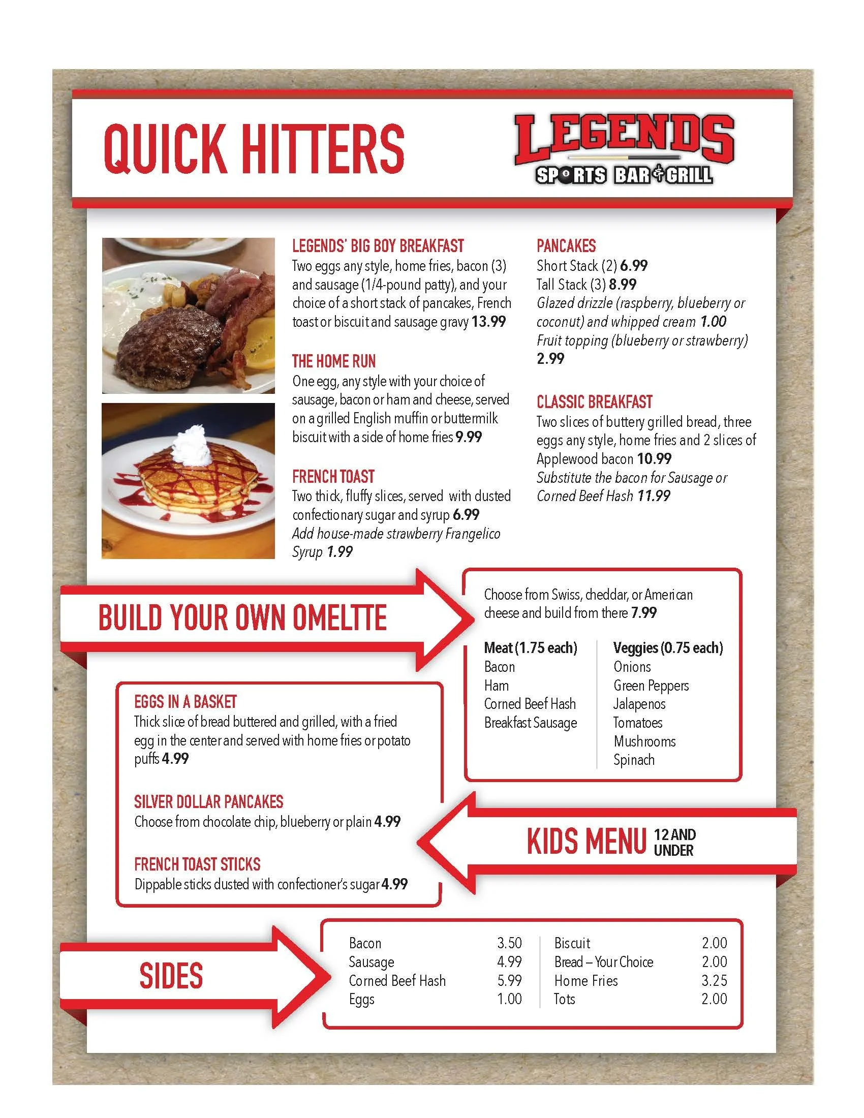 Menus for Legends Sports Bar & Grill. The main menu is above, breakfast and cocktail menus are below.