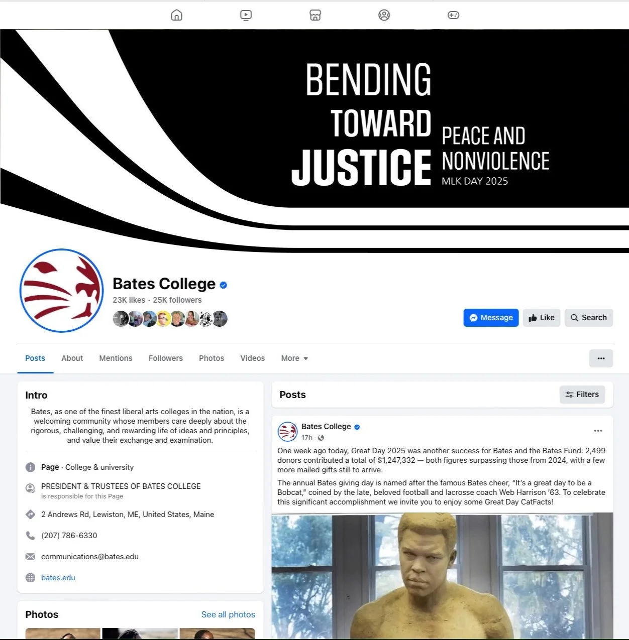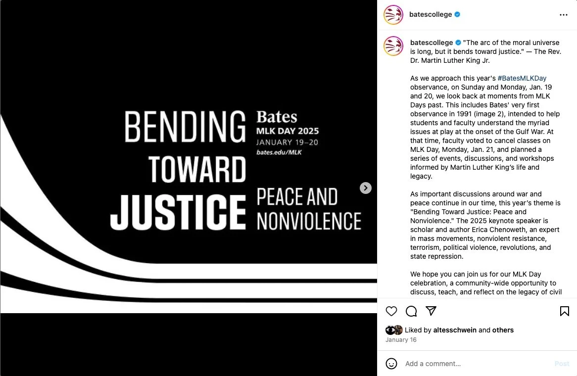 The Martin Luther King Jr. Day observance at Bates College is a community-wide event. No classes are held and students, staff, and faculty are encouraged to attend workshops and speakers to discuss, teach, and reflect on the legacy of civil rights icon Martin Luther King Jr.