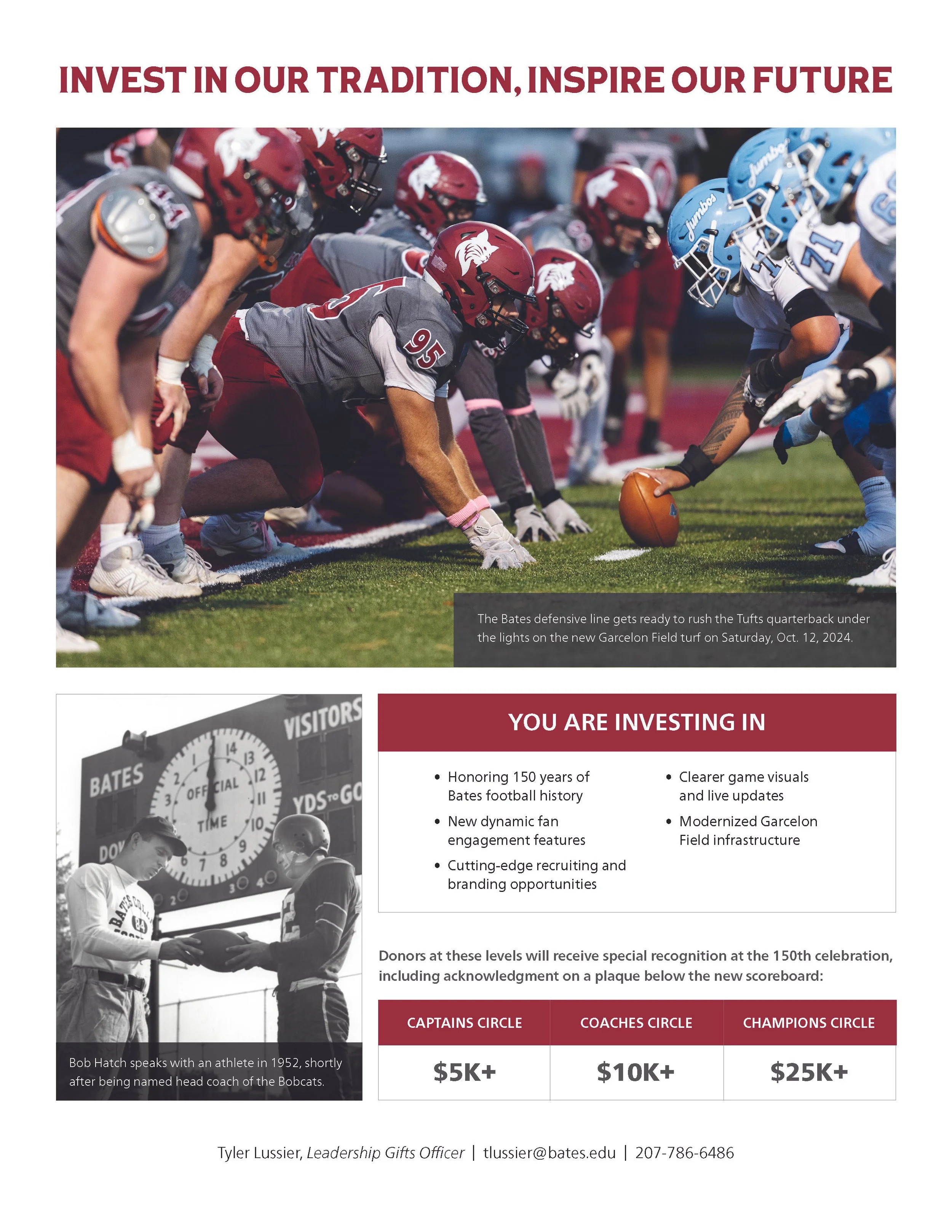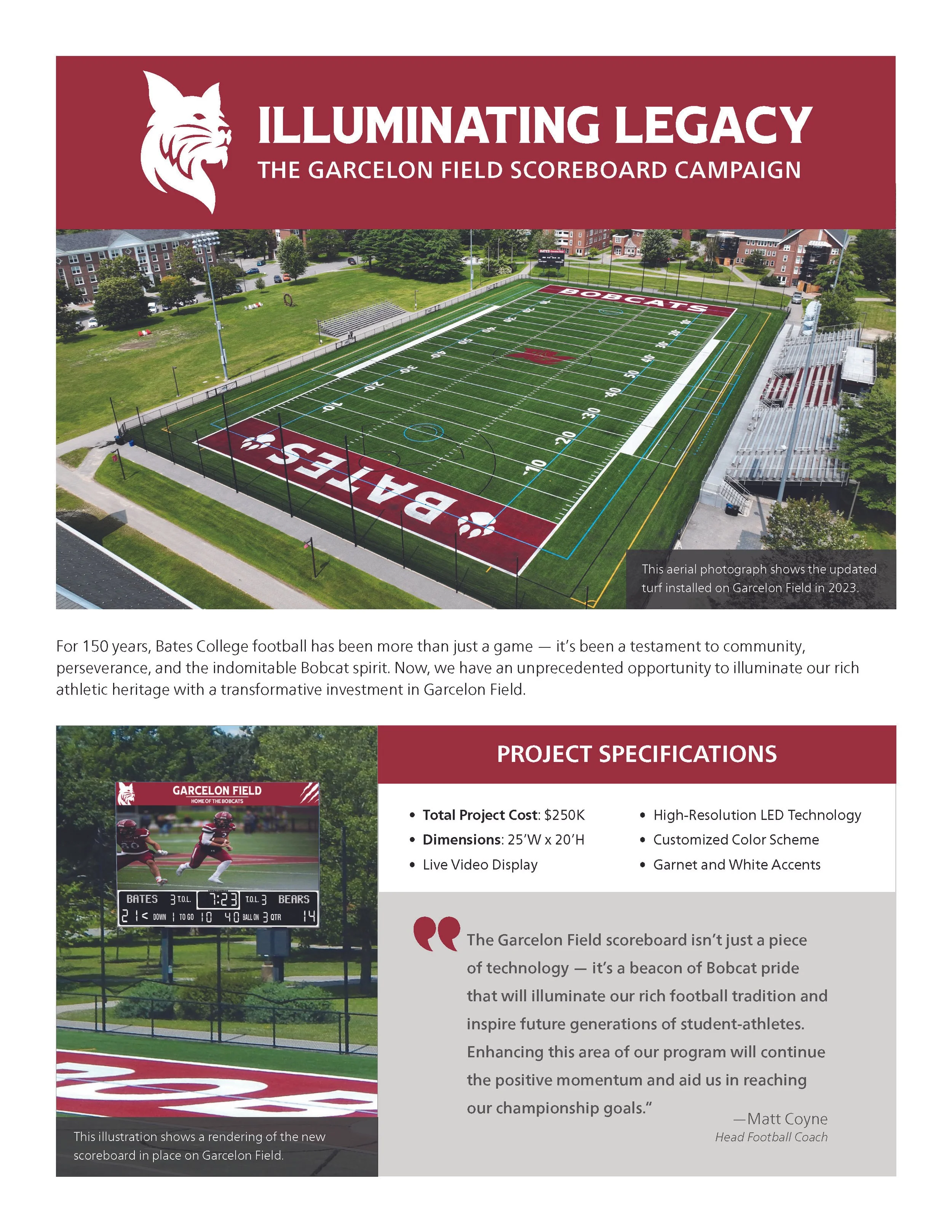 One-page fliers designed for the Bates College Office of College Advancement supporting the campaign for a new scoreboard on Garcelon Field.