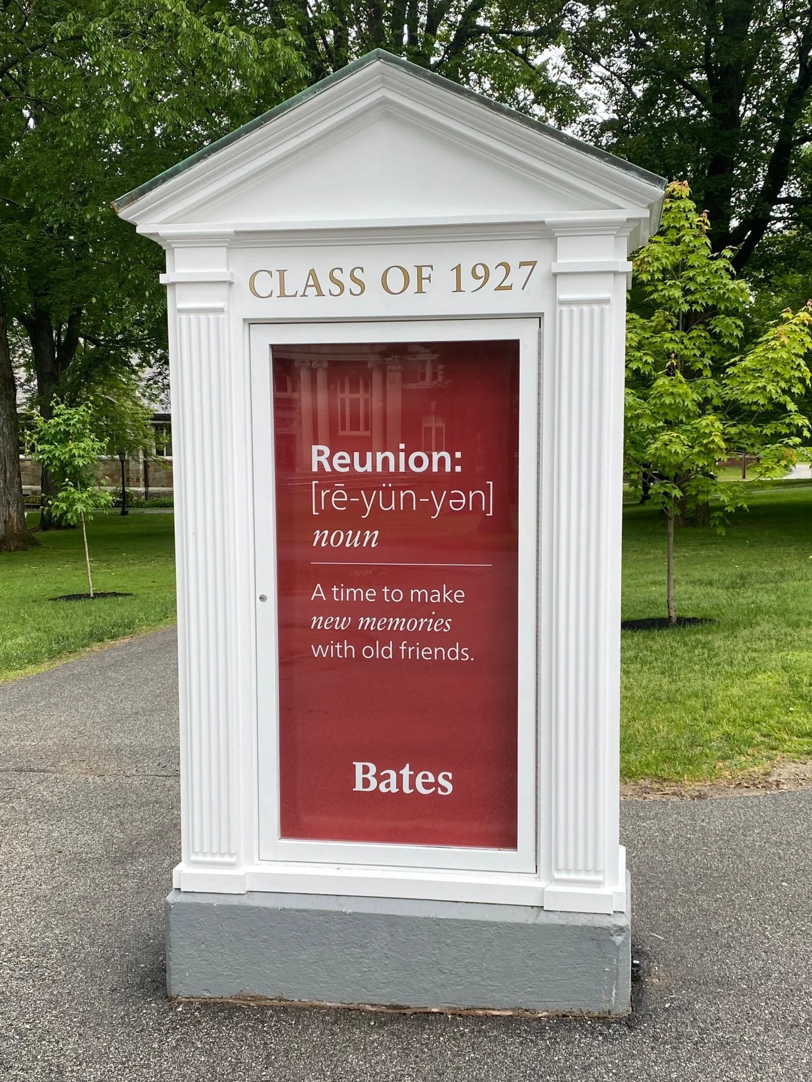 A text driven poster greets alumni and their families in the freshly restored Historic Mouthpiece at Bates College.