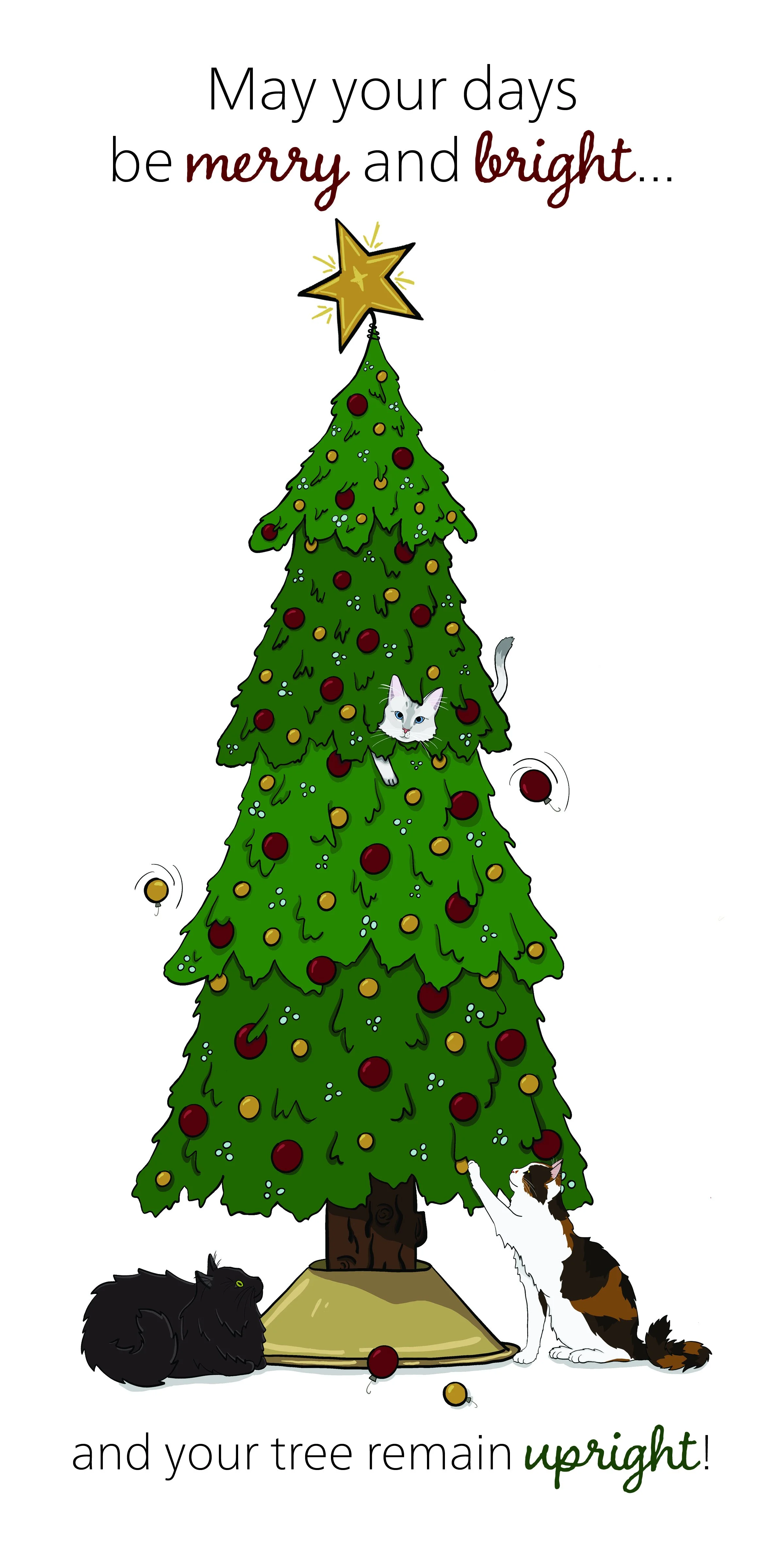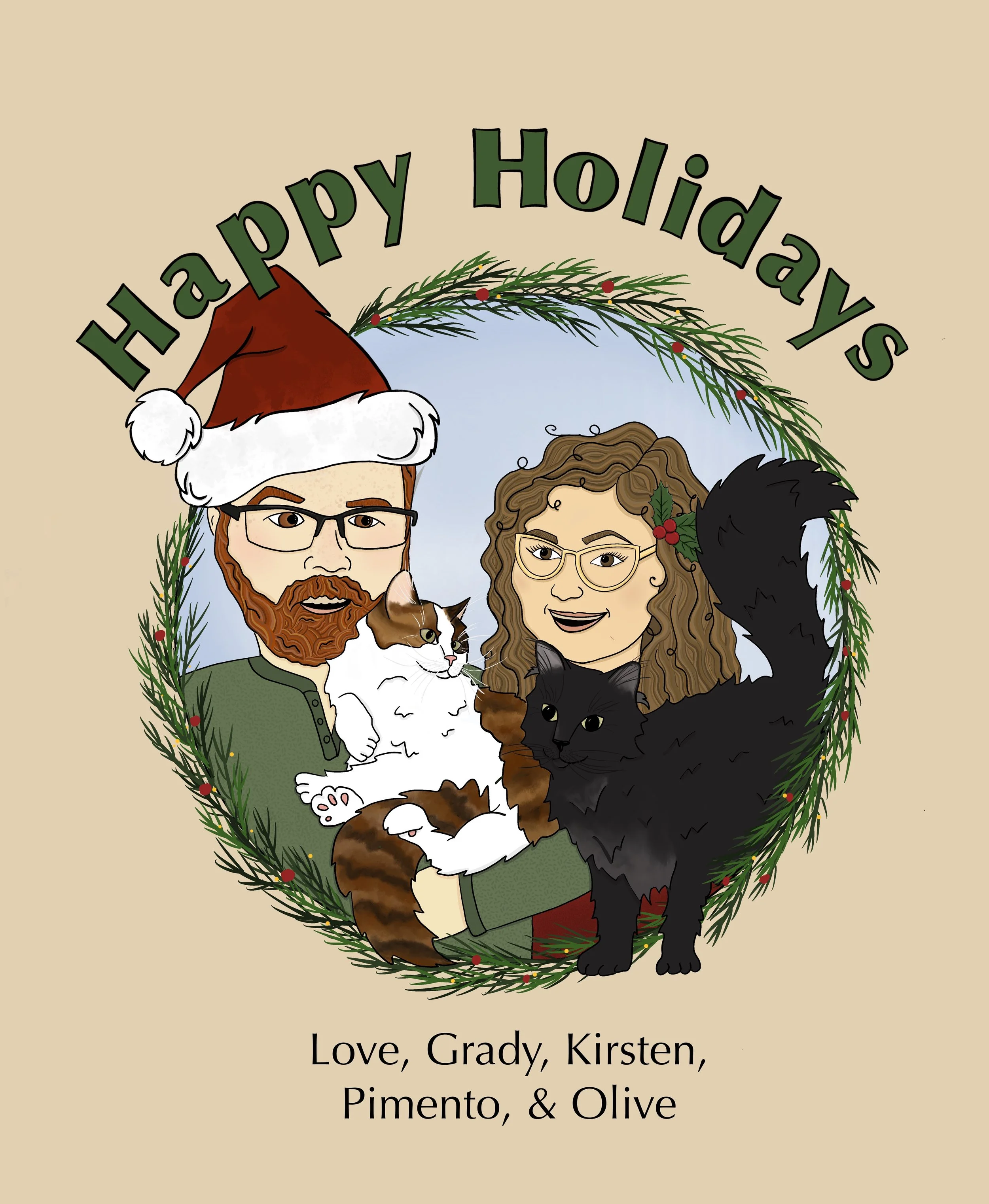 A custom illustrated holiday card, introducing a third furry member of the family.